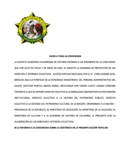 AVISO A TODA LA COMUNIDAD LA SUSCRITA ACADEMIA COLOMBIANA DE HISTORIA INFORMA A LOS MIEMBROS DE LA COMUNIDAD QUE POR AUTO DE FECHA 7 DE